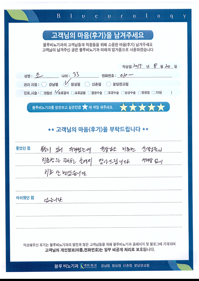 제목 [요로결석] 치료가 좀 두려웠는데 친절하고 자세한 설명에 감사드립니다.