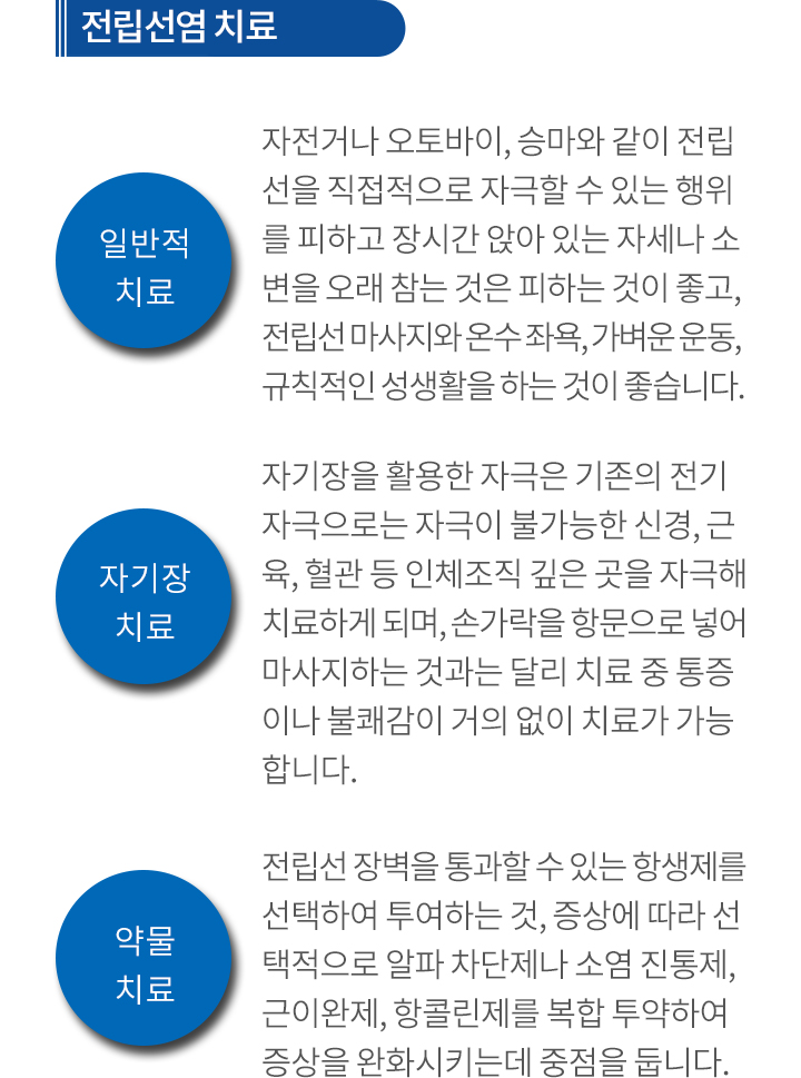 전립선염의 경우에는 세균성인지 비세균성인지에 따라 치료법이 달라지기 때문에 원인을 밝히는 것이 중요한데, 전립선염 진단은 과거 병력, 전립선액, 전립선 마사지 후 첫 소변 혹은 정액에서의 세균과 백혈구 증가 여부로 진단합니다.